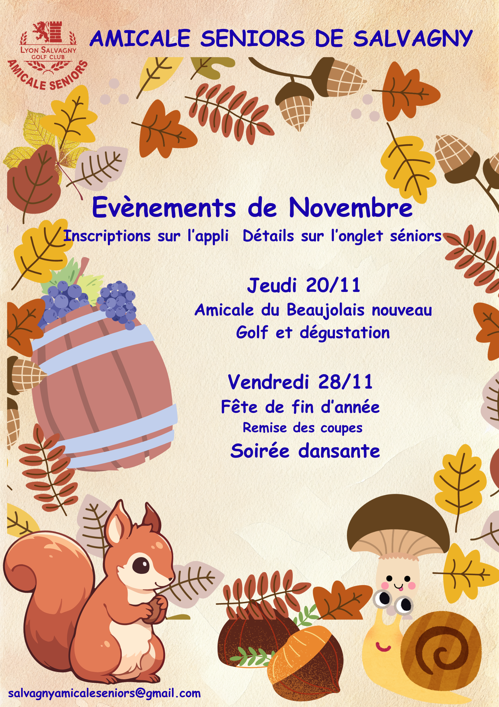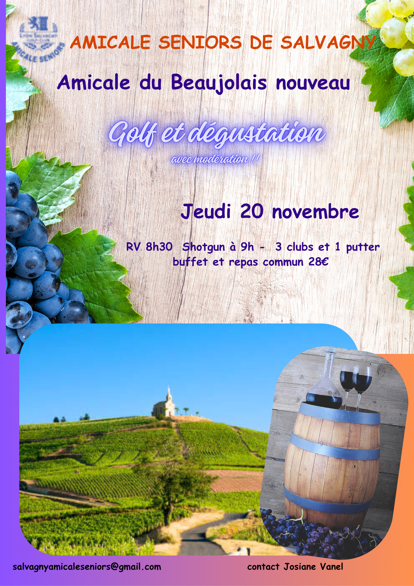 Amicale du Beaujolais nouveau | 3 clubs et 1 putter | repas 28€ | shotgun 9h |